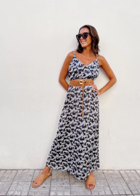 Vestido solero de corte evasé. Talle único, posee breteles regulables y esta confeccionado en seda.